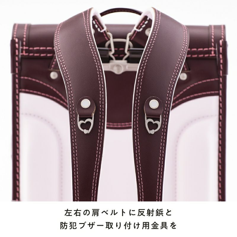 車のライトに照らされるとピカッと光る安全機能が付いています。前締めベルトの反射テープ、肩ベルトの両側の反射鋲は、大きさや位置などランドセルのデザインを損なうことのないよう、こだわって設計しました。